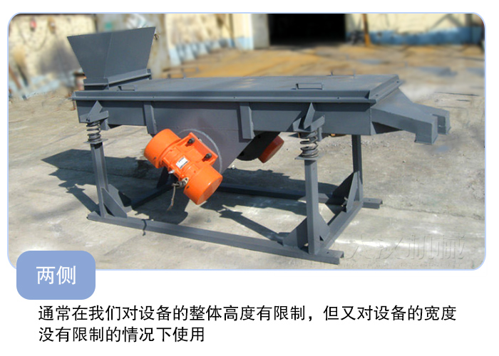 這種安裝方式也是直線振動篩設備振動電機較為采用的方法。通常在我們對設備的整體高度有限制,但又對設備的寬度沒有限制的情況下使用。比如因為一些物料的特殊要求,設備的出料口不能離地太高啦,在這種情況我們?nèi)绻烧駝与姍C安裝在直線篩的底部或者頂部,那么設備的整體高度就不好控制了。一般來說直線篩的篩箱的高度通常是一定的,所以我們不能對篩箱的高度做調(diào)整,這是就可以考慮將振動電機安裝在直線篩的兩側,這樣可以大大的降低設備的整體高度,又不影響設備的工作效率。