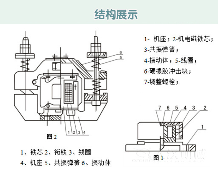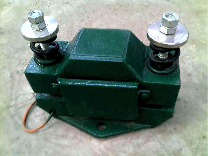 倉(cāng)壁振動(dòng)器由振動(dòng)體、共振彈簧、電磁鐵、底座等部件組成。
